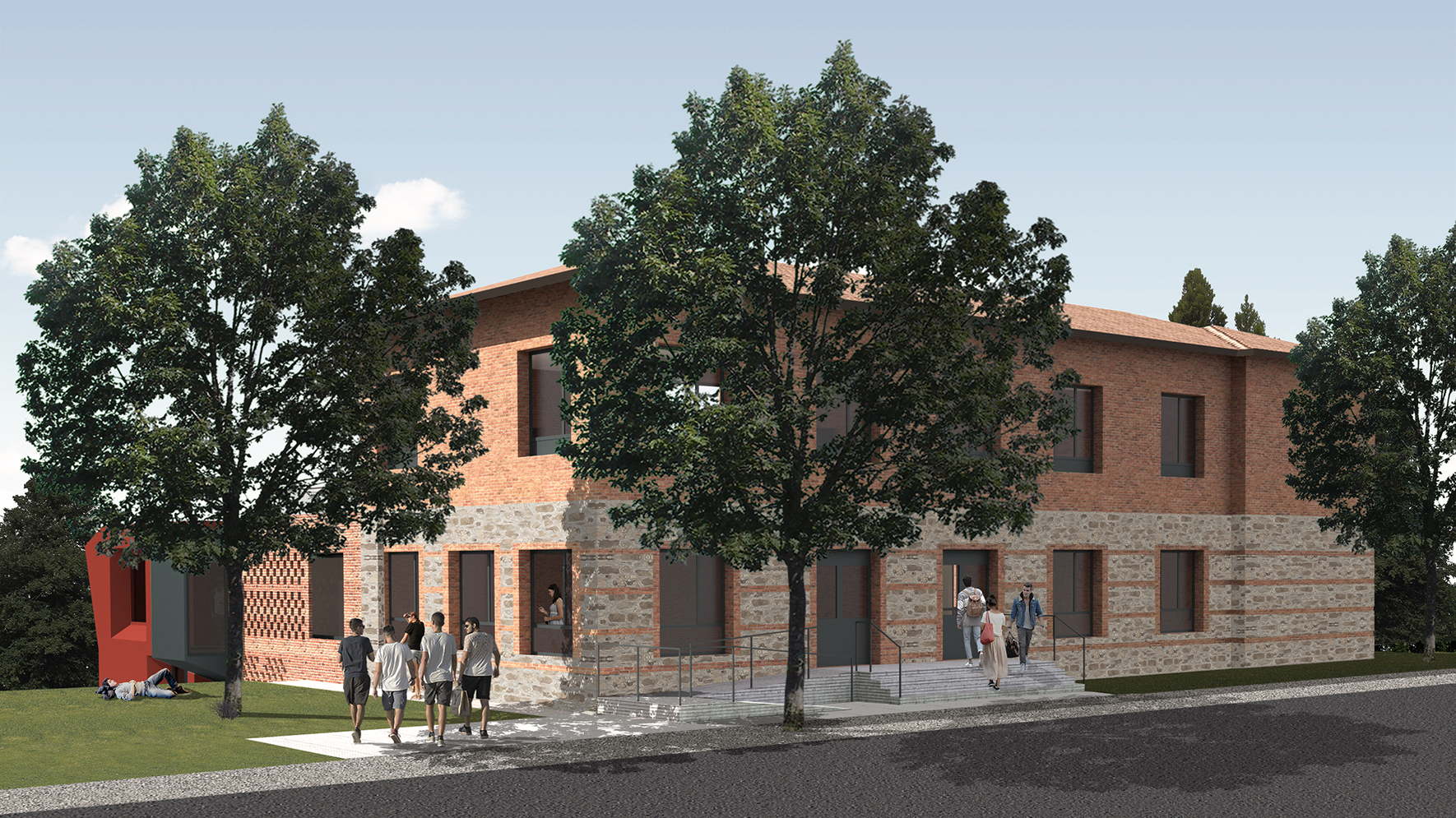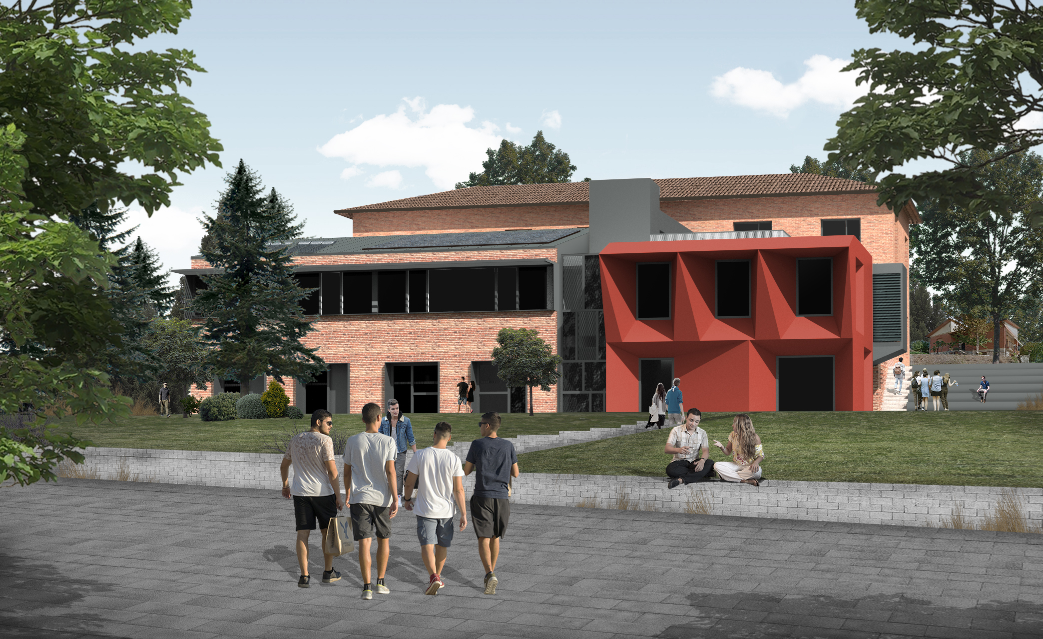 Il progetto prevede la ridefinizione degli ambienti interni dell’edificio esistente e l’ampliamento dello stesso con una nuova costruzione per la creazione di aule e laboratori, oltre a una serie di servizi annessi. Un organismo architettonico che si sviluppa attorno a una corte centrale di relazione tra l’edificio esistente e il nuovo intervento.