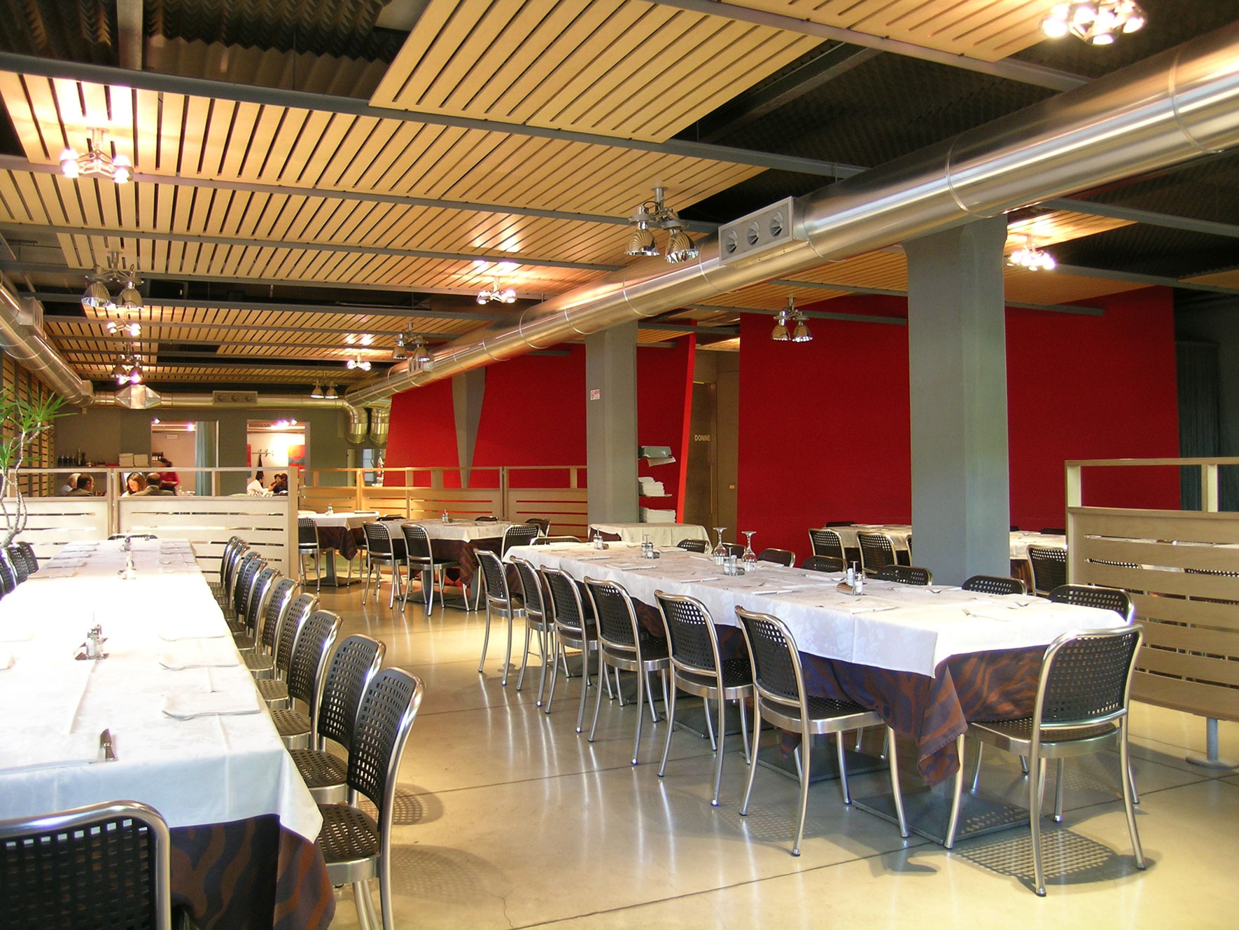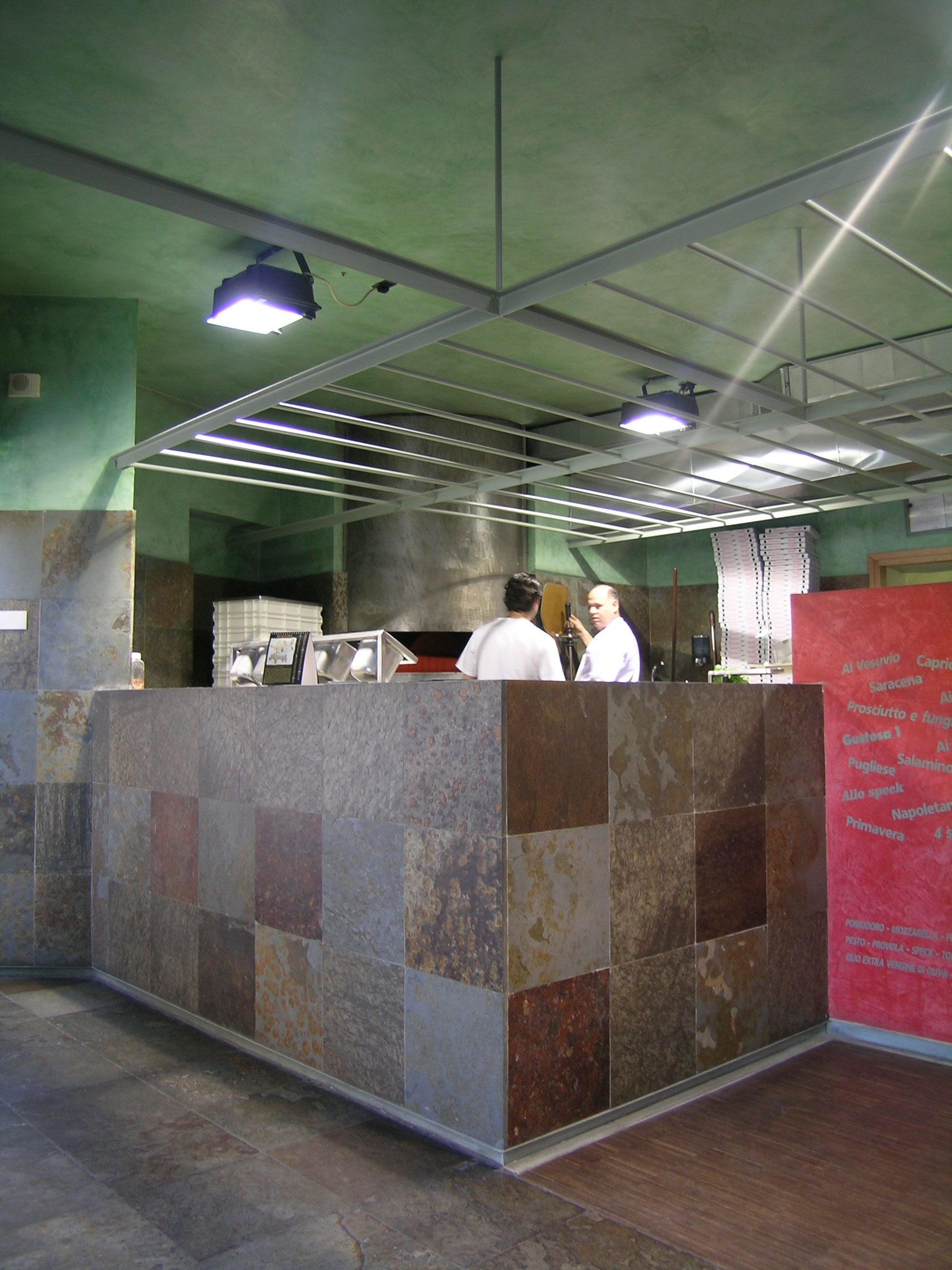 Ampliamento della pizzeria Vesuvio in Borgo Santa Caterina a Bergamo, ricavato negli spazi di una ex officina meccanica. Ricambio frequente dell’aria primaria, correzione dell’inquinamento acustico, qualità della luce artificiale, regolazione dei flussi della clientela. L’obbligo di risolvere le criticità tipiche dei locali pubblici di somministrazione ad alto affollamento ha guidato le scelte dei dettagli architettonici.