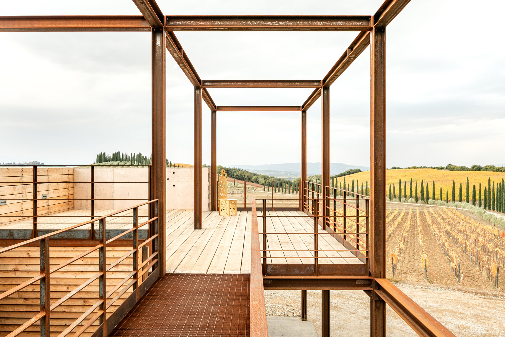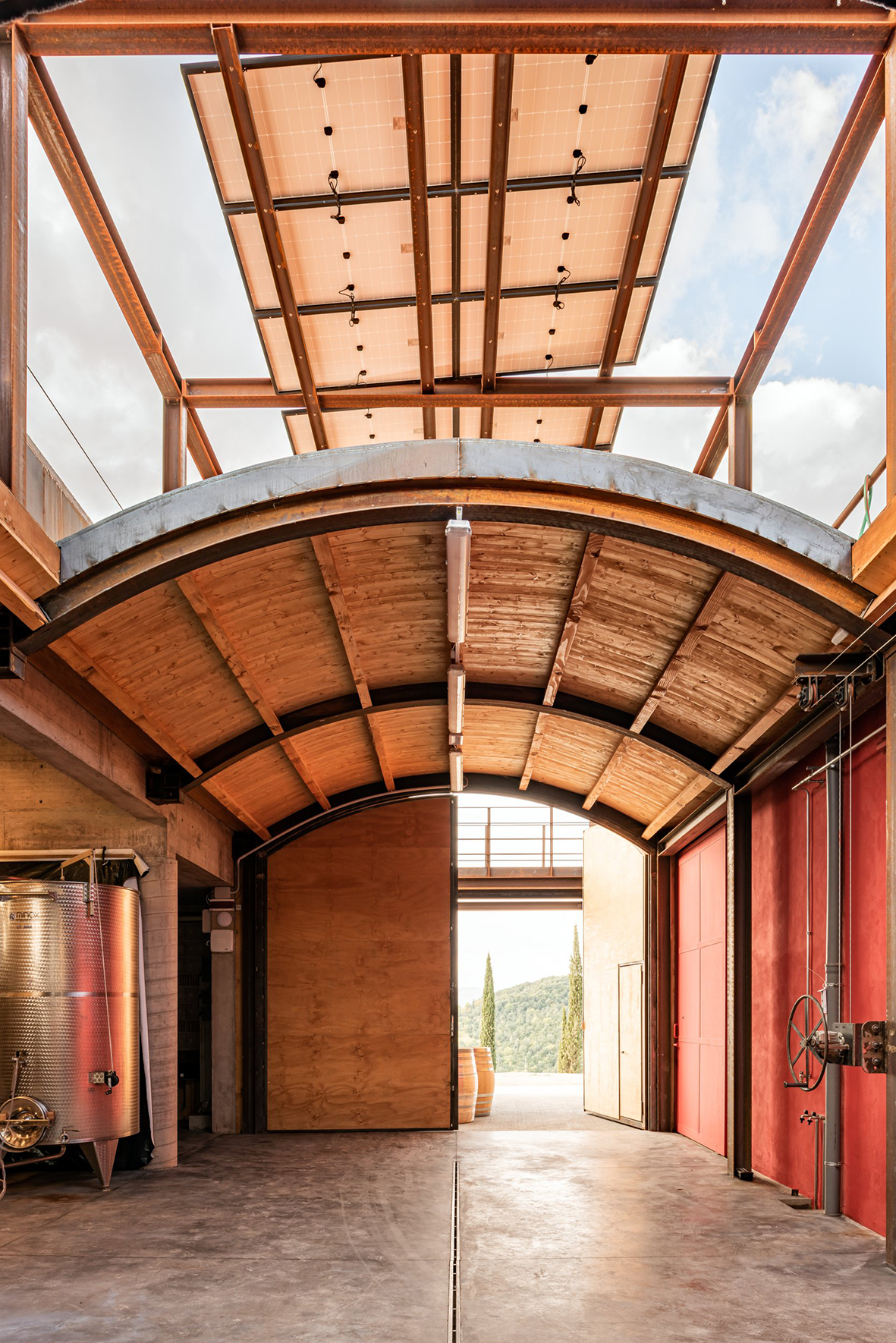 Sulle facciate, differenti tipologie di bucature sono in grado di marcarne la differente composizione materica: piccole finestrelle quadrate sul calcestruzzo a vista, in parte fisse e in parte apribili, disposte per portare luce nella zona di vinificazione senza eccessivo abbagliamento; fessure orizzontali sulle pareti scandite dalle tavole in legno; una grande vetrata alla fine del corridoio centrale, orientata a est per illuminare l’intero androne dedicato alla lavorazione e alla movimentazione del prodotto.