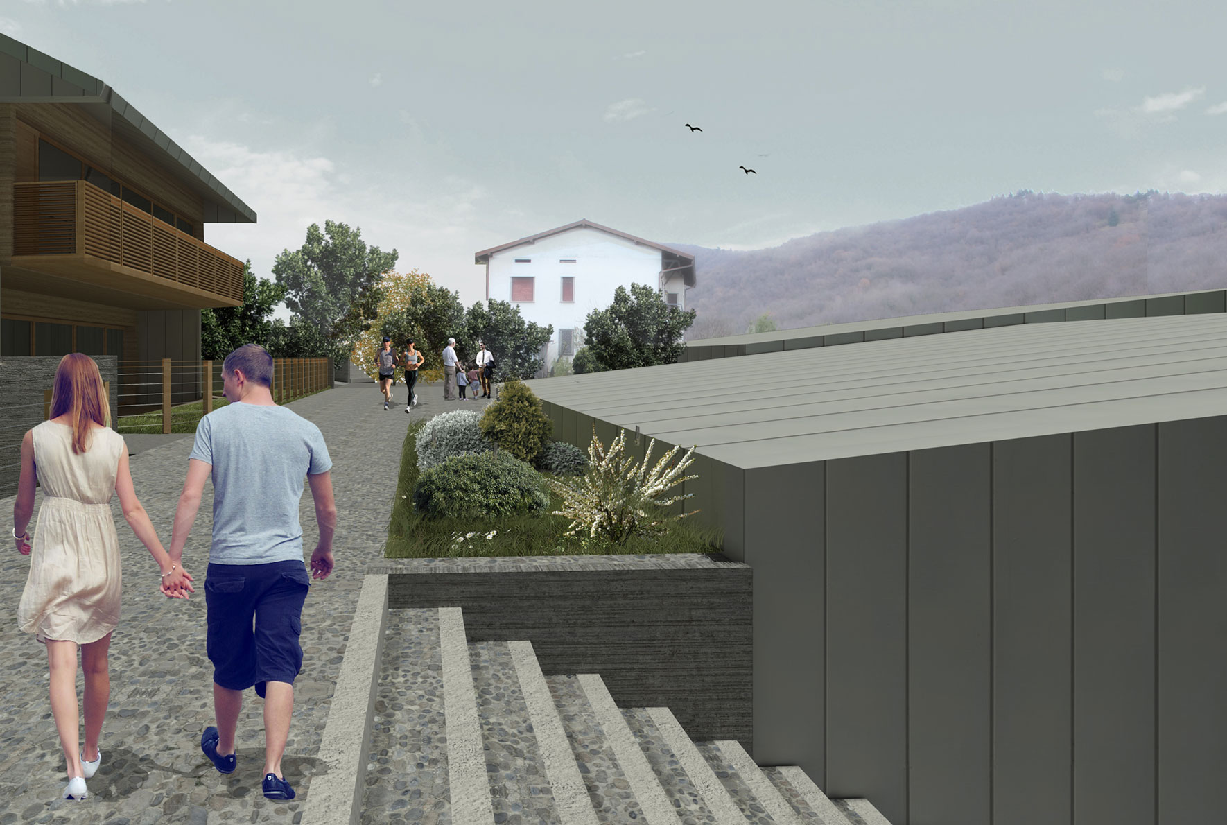 Il contesto nel quale si inserisce il piano attuativo è un’area verde situata al margine del nucleo di antica formazione dell’abitato di Ponteranica. A valle dell’area sono presenti servizi pubblici e attrezzature sportive. Le opere proposte si inseriscono nel paesaggio circostante senza soluzione di continuità, nel dettaglio i materiali e le finiture identificate privilegiano l’uso di elementi naturali quali il legno e l’acciottolato che ben si inseriscono nel contesto.