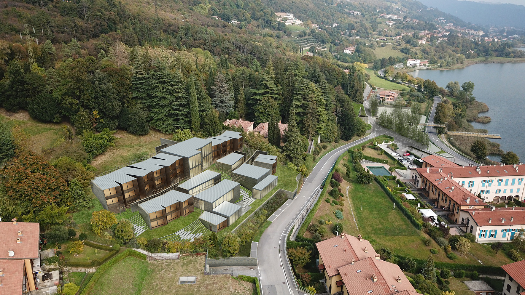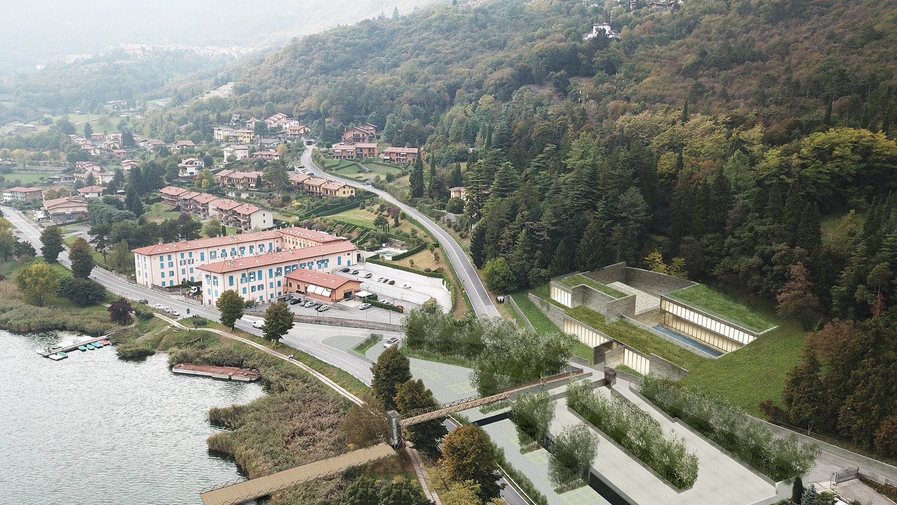 Un piano di recupero di Villa Crescenzi – Terzaghi al fine di inserivi un centro termale e un complesso ricettivo sul lago di Endine che sia anche volano per l’economia turistica. Una sorta di borgo naturalistico con servizi alla persona in totale integrazione con la natura, posto su più livelli allo scopo di assecondare i piani di campagna nel pieno rispetto dell’ambiente e della preesistenza.
