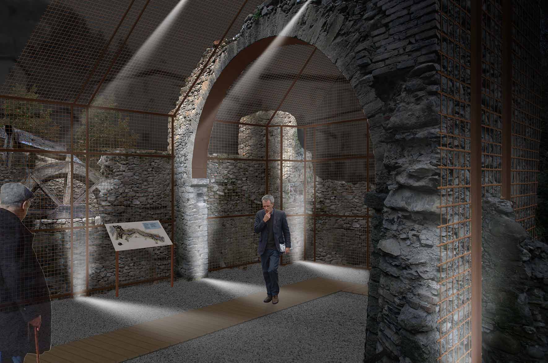 Le murature esistenti del maglio saranno "ingabbiate" attraverso l'utilizzo di reti elettrosaldate in ferro e sostenute da profili a "U" con lo scopo di sostenere e non far crollare la struttura esistente. Inoltre questi profili metallici saranno utilizzati per ricostruire figurativamente la sagoma della copertura dell'edificio preesistente. L'utilizzo di elementi metallici lasciati all’ossidazione naturale costituisce una scelta progettuale che si lega alla storia siderurgica dell'intera area.
